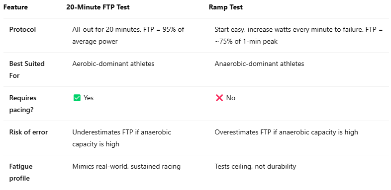 The 20-minute test is ideal for endurance athletes with a strong aerobic base, while ramp tests can flatter athletes with high anaerobic power (i.e., sprinters or athletes with high VLamax).